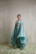 Silk blouse paired with silk cape and cowl pants with dori and resham work accentuated with boho tassels.