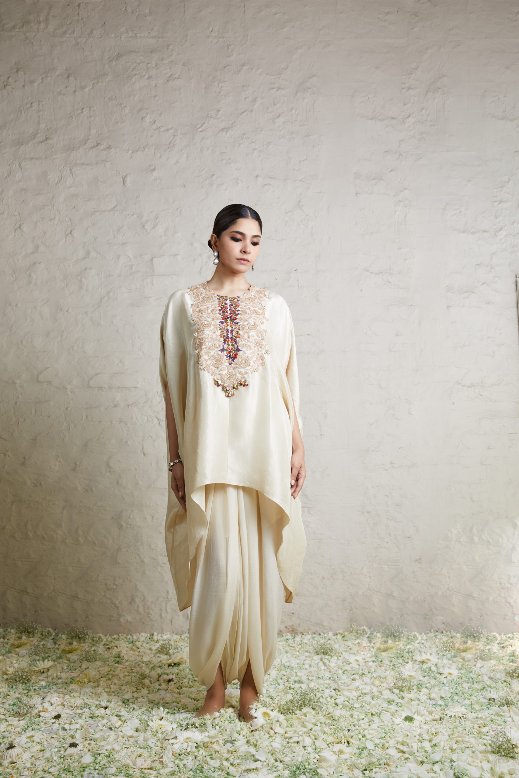 Antifit kaftaan paired with dhoti with dori work accentuated with threadwork and boho tassels.