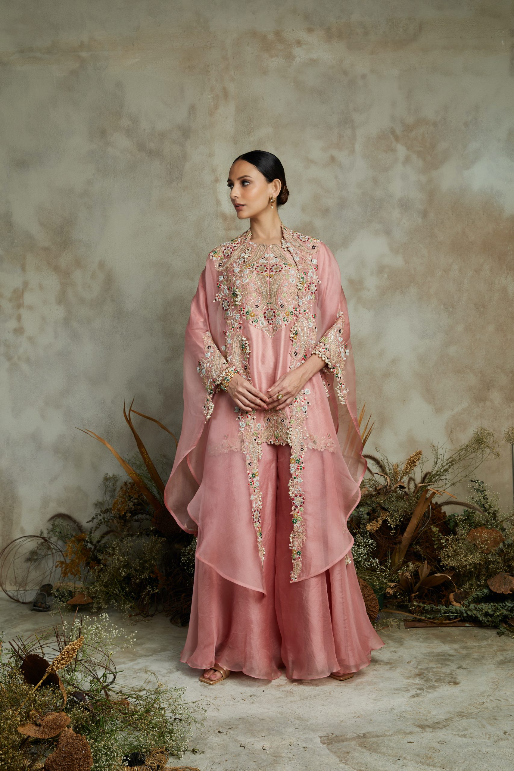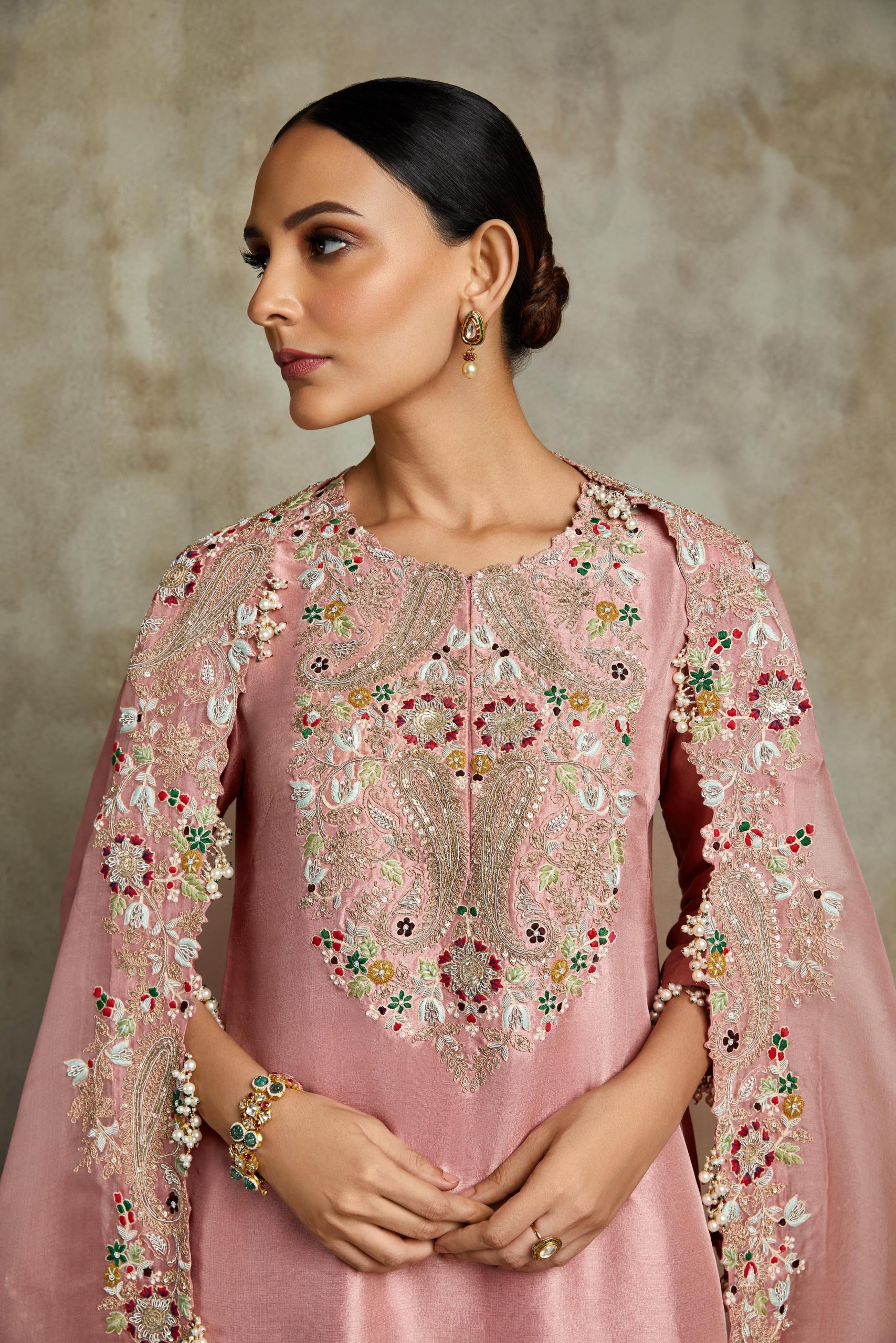Kurta paired sharara and cape with dori work accentuated with threadwork and pearl tassels.